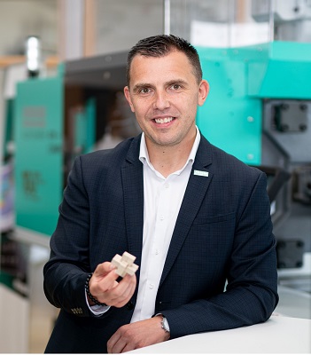 Paper injection moulding is particularly innovative. A hydraulic Allrounder 420 C Golden Edition with a clamping force of 1,000 kN used this process to transform what are known as “paper pearls” into a 3D puzzle. The main component of the sustainable material comprises paper fibres. These are made injection mouldable using bio-based and biodegradable plastics, e.g. based on lignin, starch or corn.